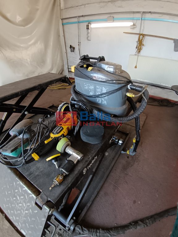 -autókozmetikai munkákhoz kiépített erős, professzionális világítás