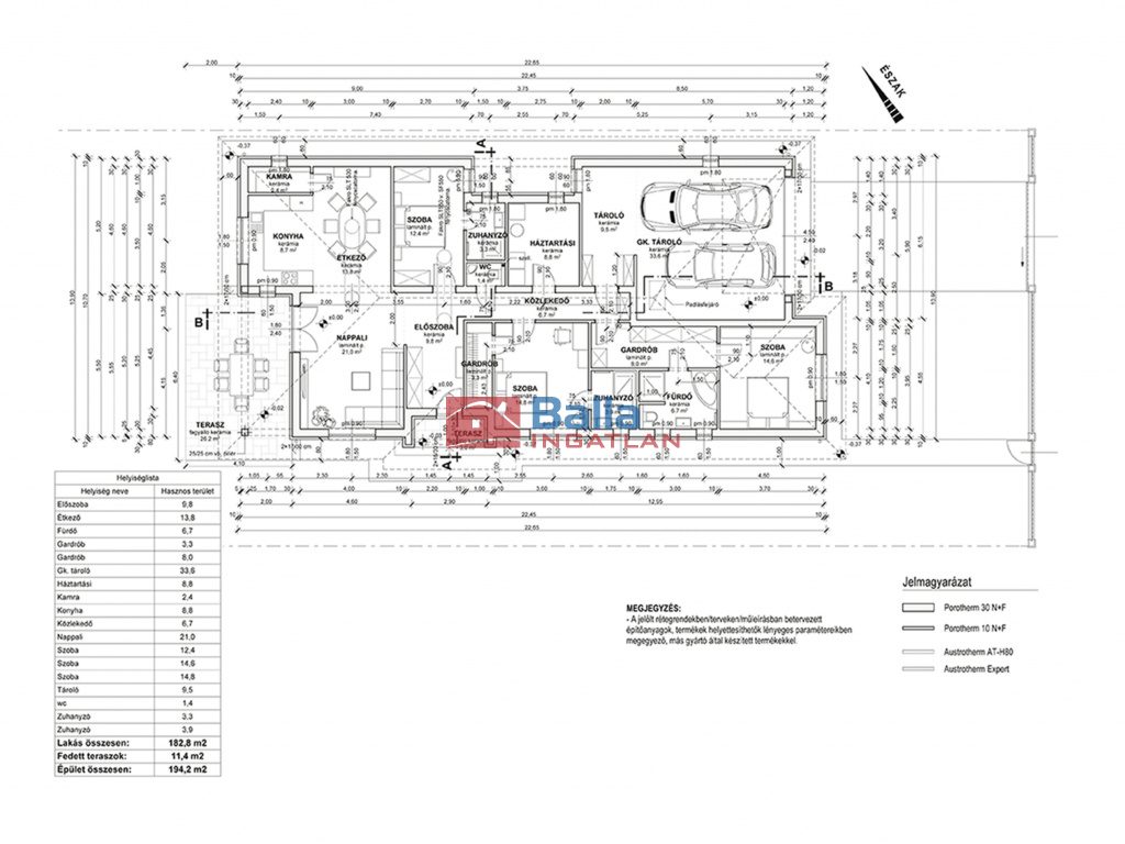 Egyéb tulajdonságok: külön étkező, külön wc, gardróbszoba, kamra, terasz (20 m²), garázs, zárt autóbeálló
