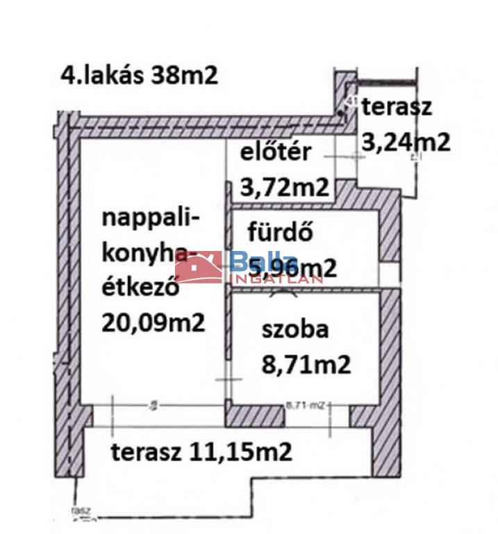 • Lakás alapterülete 38m2, kert 88m2, terasz 14m2