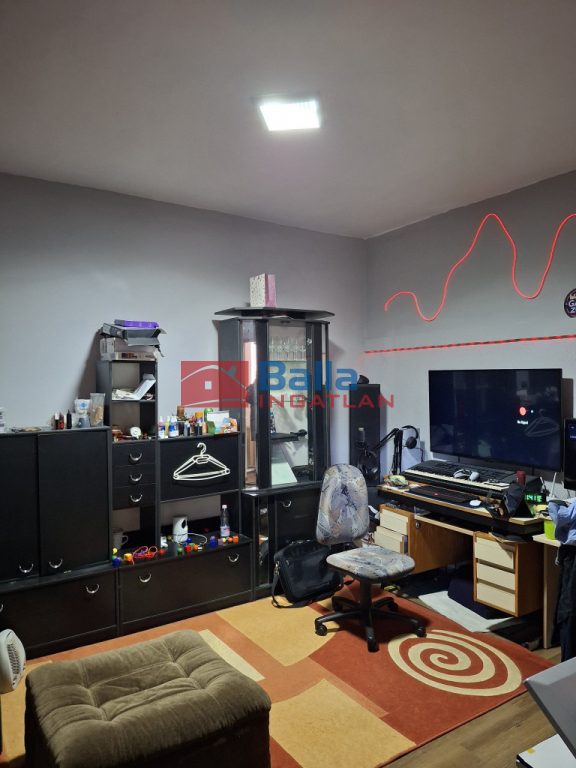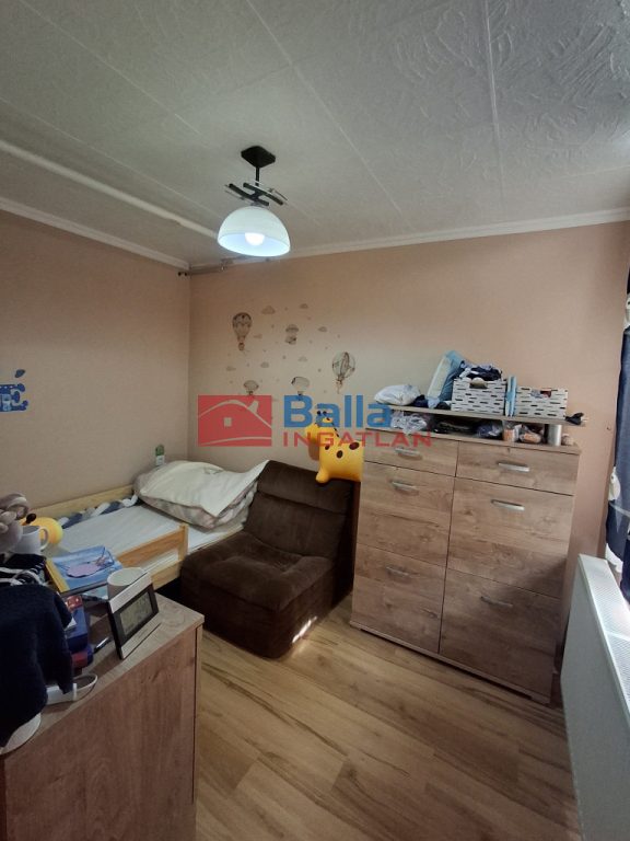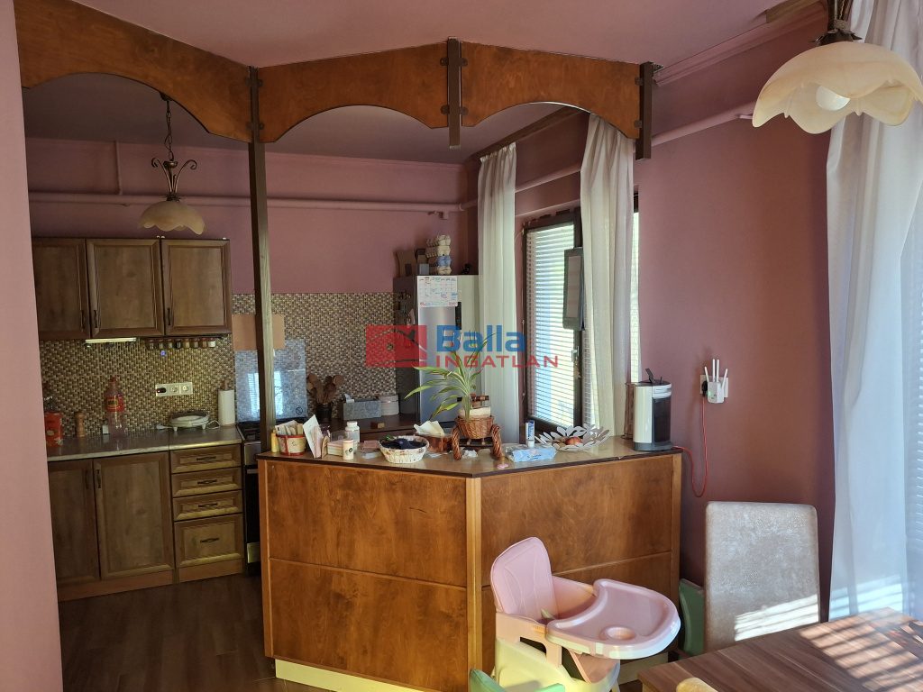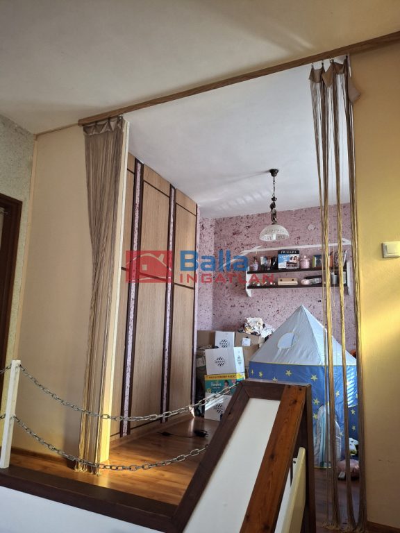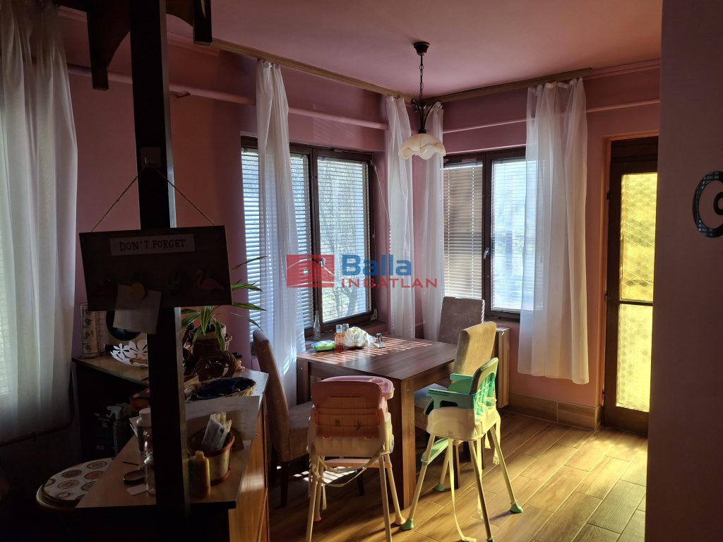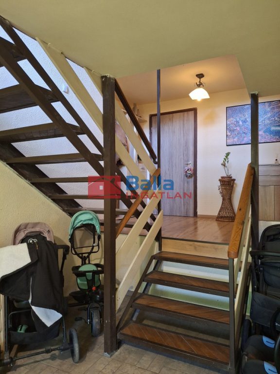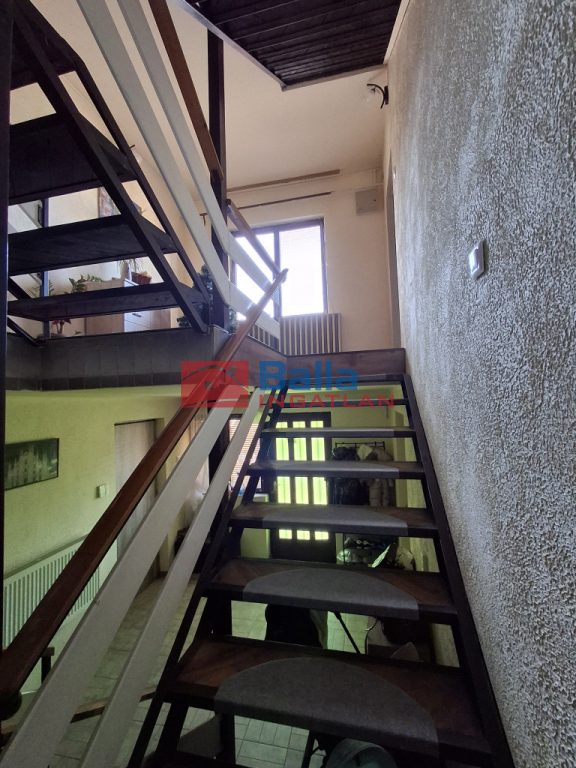 Eltolt szintes, négy szoba található a földszinten és két szoba az emeleten, egy fürdőszoba, két különálló WC és tárolóhelyiség, nagy étkezős konyhával, erkéllyel és egy terasszal.