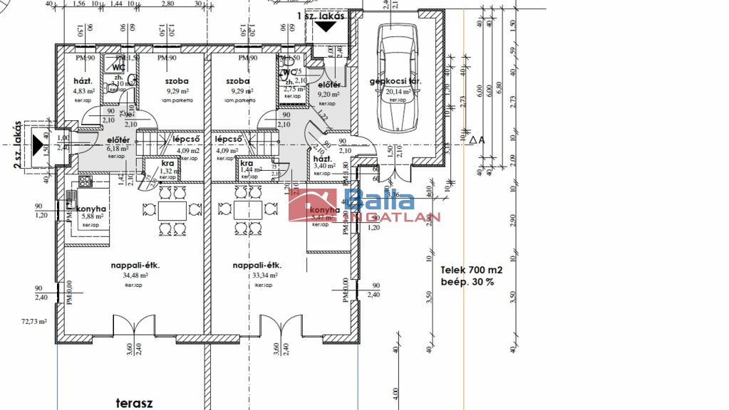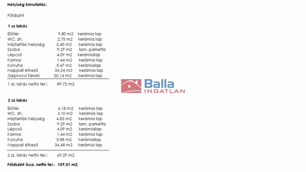 A 2 lakásos ház egy-egy lakása és kertje fizikailag és helyrajzi szám alapján is önálló, nincsenek közös használatú részek. A 2. számú lakás földszintje 69,29 nm, tetőtere netto 52,94 nm területű. A földszinten nappali-étkező, amerikai konyha, 1 szoba, fürdőszoba+wc, kamra, háztartási helység található. A tetőtérben 3 szoba, gardrób, fürdő+wc, wc található. A földszinti terasz a hátsó kertre néz.