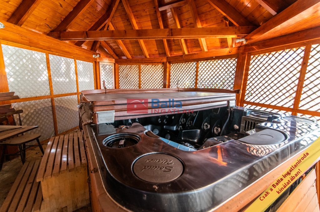 A kertben két különálló, fa szerkezetű építmény biztosítja a kényelmet és a wellness élményt: