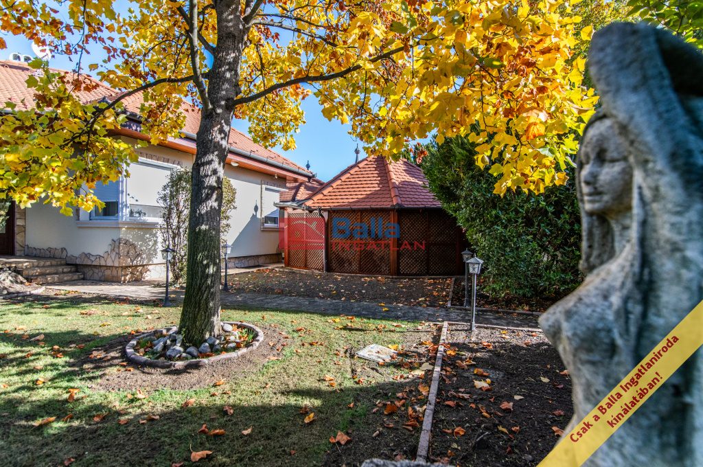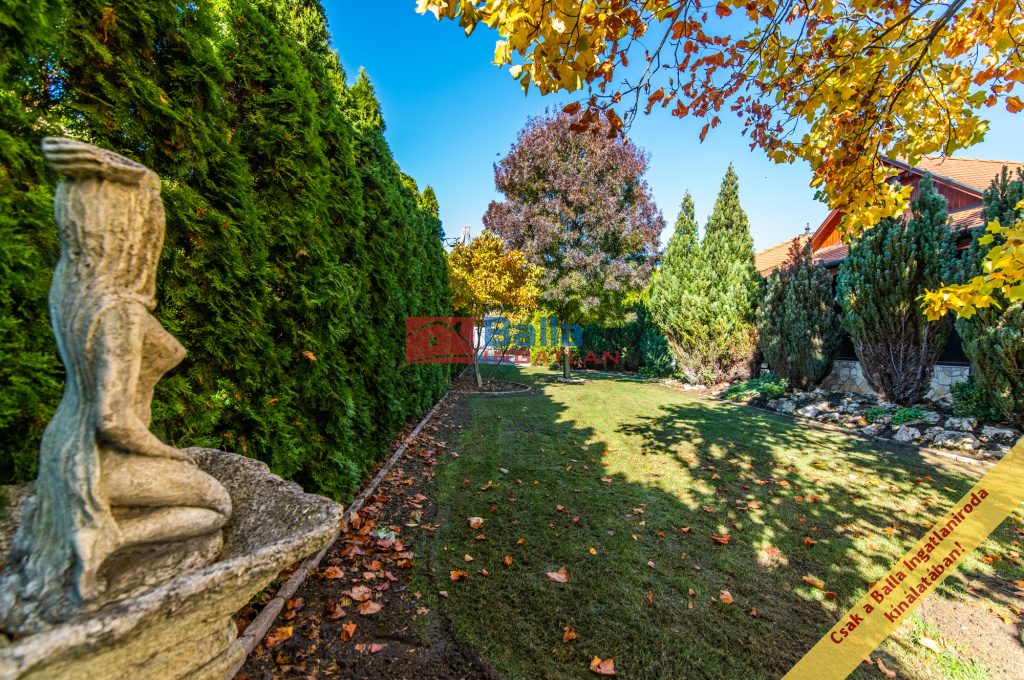 Az ingatlanhoz tartozó privát, gondosan kialakított díszkert gyepszőnyeggel borított, automata öntözőrendszerrel ellátott, fás-bokros növényzettel, tujákkal szegélyezett, ahol egy kellemes érzetet nyújtó szobor is található.