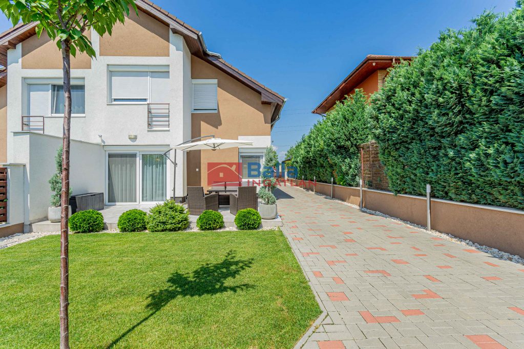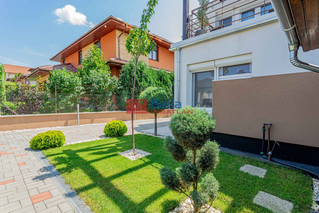 A kertben gyepszőnyeg, illetve örökzöldek kerültek telepítésre, automata öntözőrendszer gondoskodik a folyamatos locsolásról.