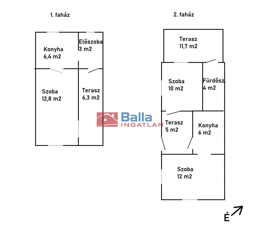 Két könnyűszerkezetes épület áll a telken. Az egyik 36 m2-es, két szobával, konyhával és egy fürdőszobával rendelkezik. A másik faház 29 m2-es, egyszobás, konyhával és előszobával rendelkezik. Mindkettőnek van egy-egy kis terasza is.