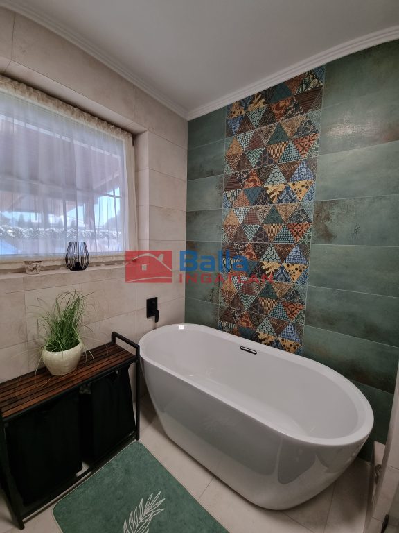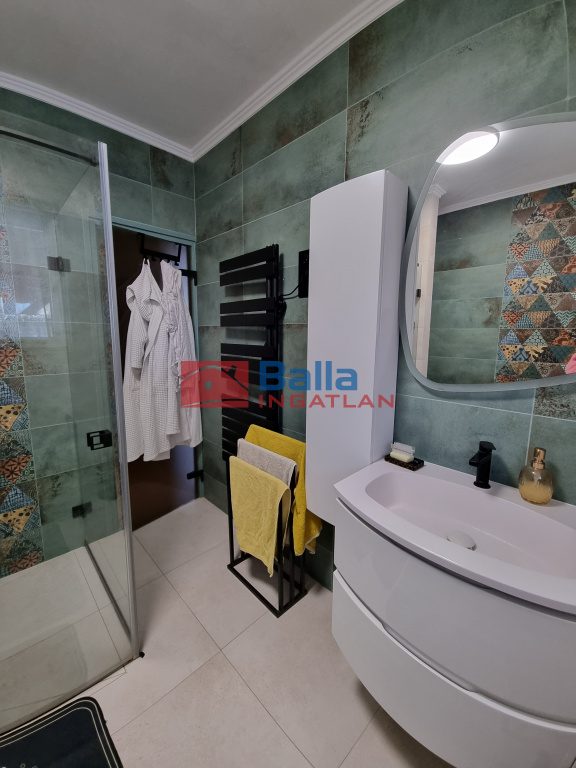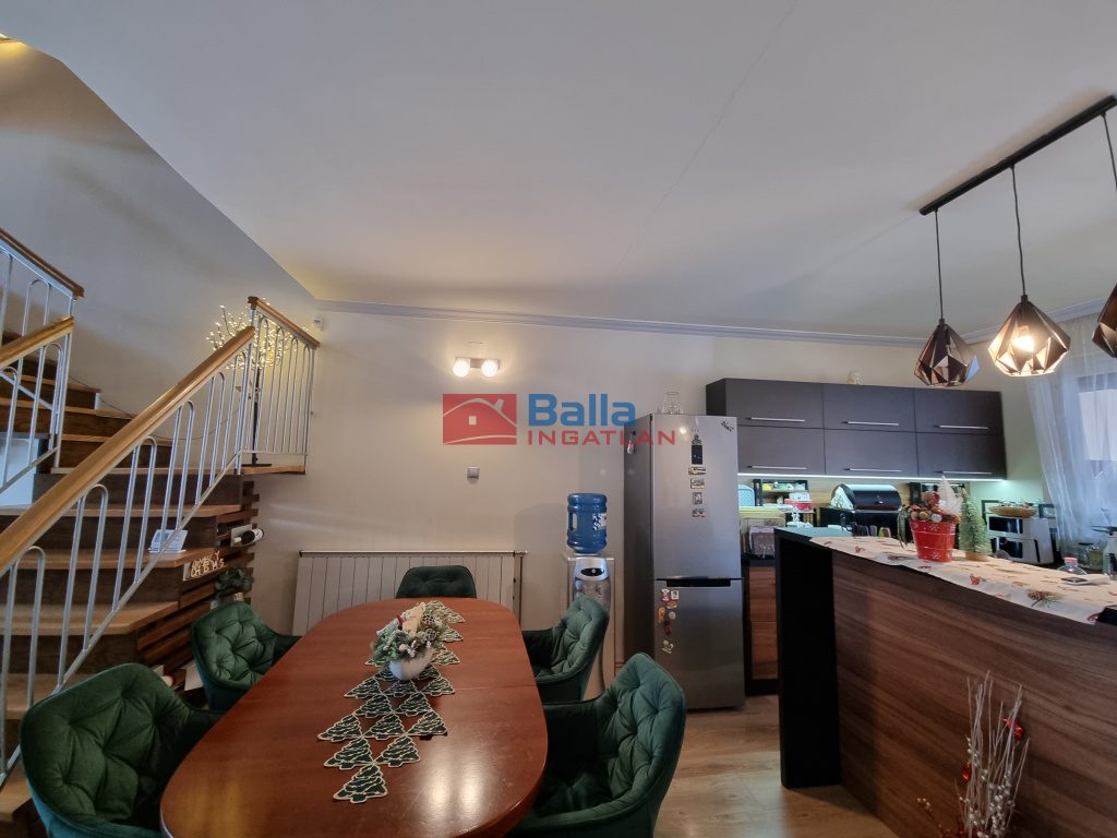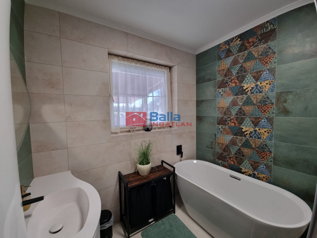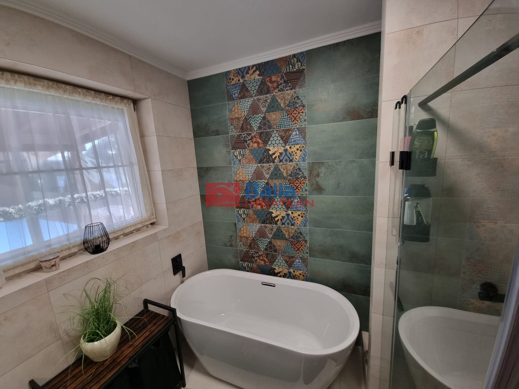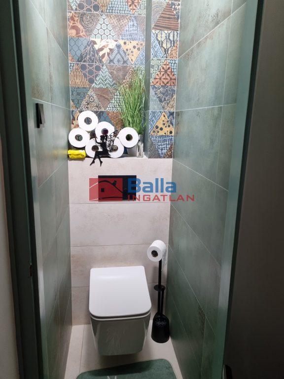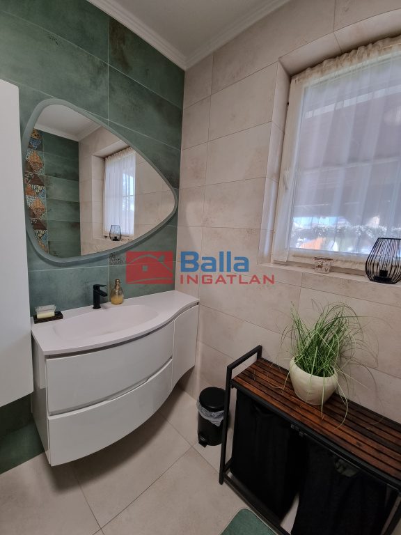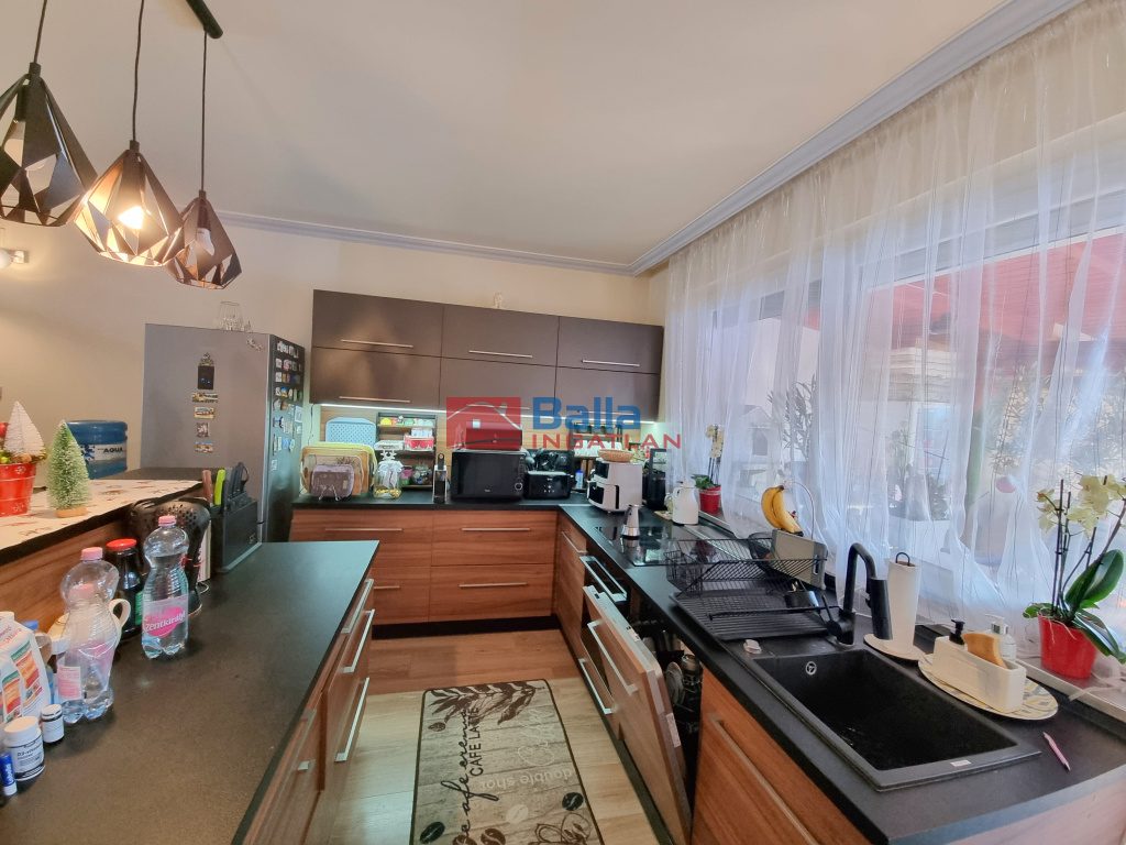 Az előszobából hangulatos, meleg, otthonos színekkel bíró nappalin keresztül érünk a 2019-ben teljes felújításon átesett, jó ízléssel kialakított konyhába, ahol nagy munkafelület és a magas színvonalú konyhai gépek várják leendő konyhatündérüket. Innen kilépve a fedett, hőszigetelt födémű teraszra, elénk tárul a parkosított, automata öntözőrendszerrel is ellátott kert. A földszinti fürdőszoba színes, melengető színeket kapott a 2024-es teljes felújítás után és új szanittereket.
