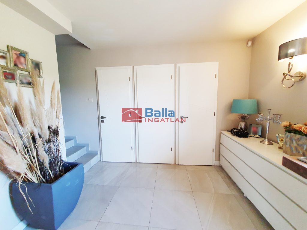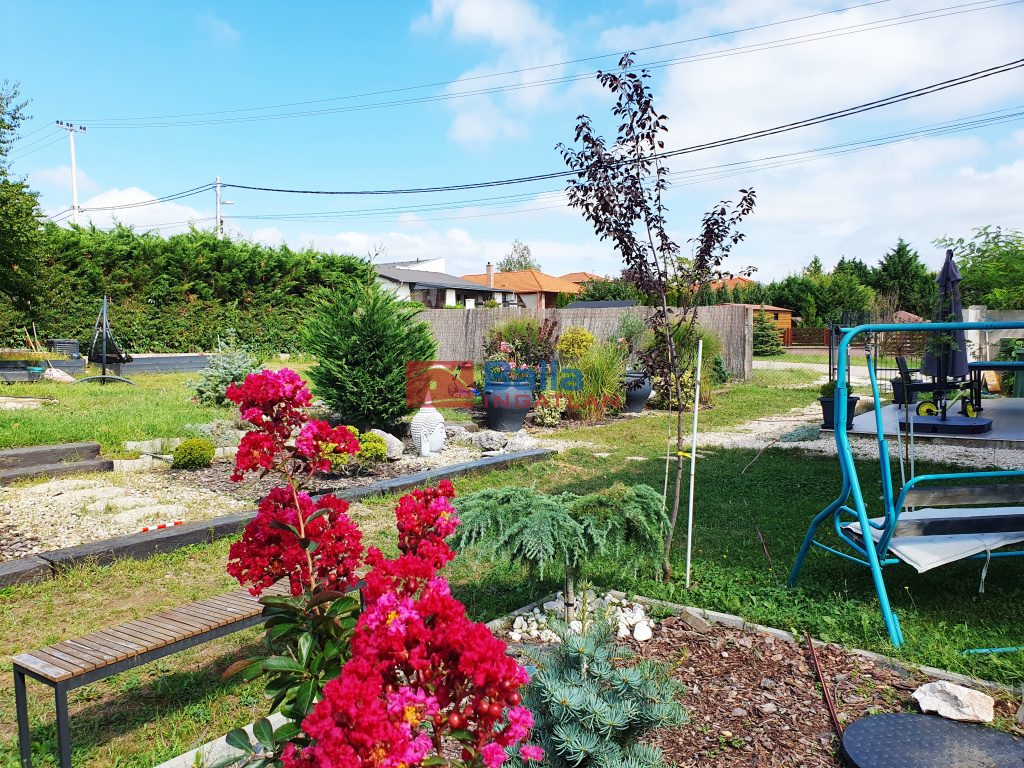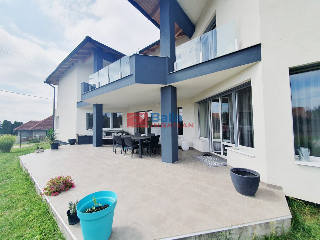 Az egyik lakrészhez az 50 nm nappali mellett fűtött, dupla, motoros távműködtetésű ajtóval zárt, 2 autó beállására alkalmas garázs és 300 nm-es telekterület, összességében 48 nm terasz tartozik. A másik lakrész 828 nm-es telekterületen, összességében 65 nm-es terasszal kialakított, nappali itt közel 70 nm-es, központi porszívó és központi szennyes ledobó.