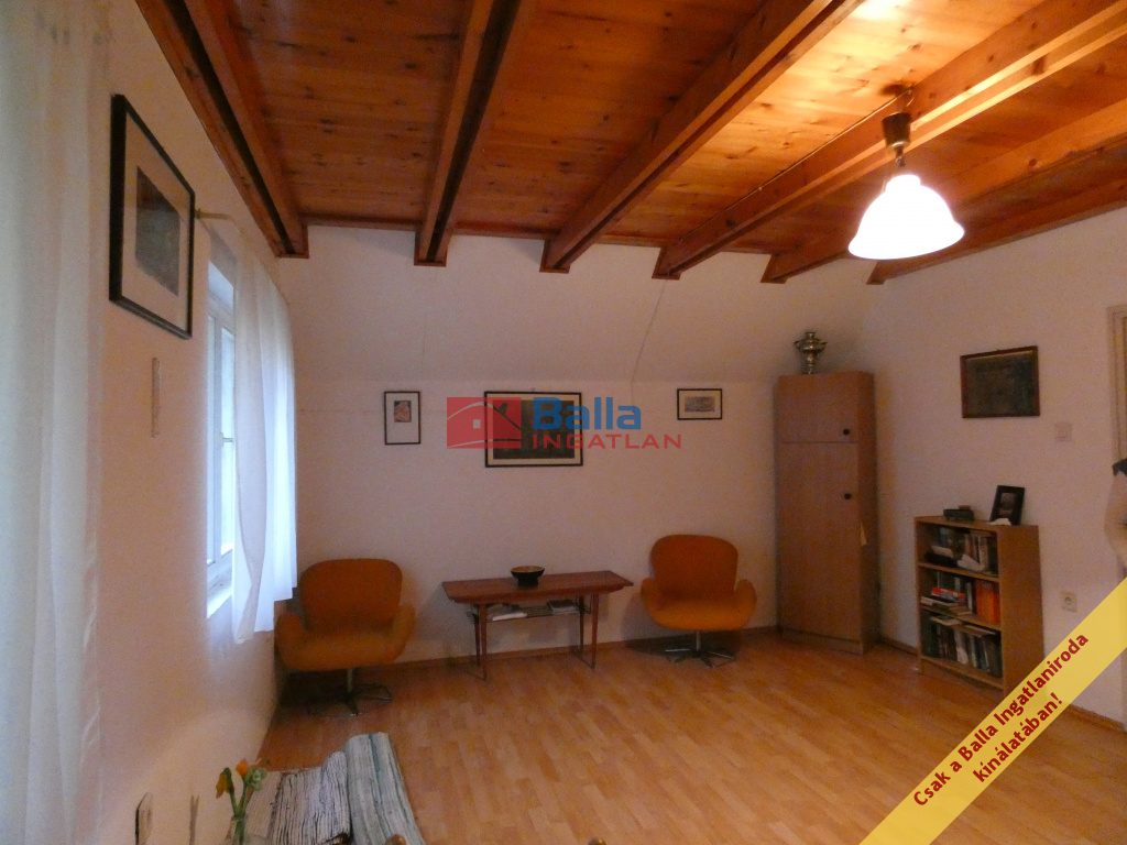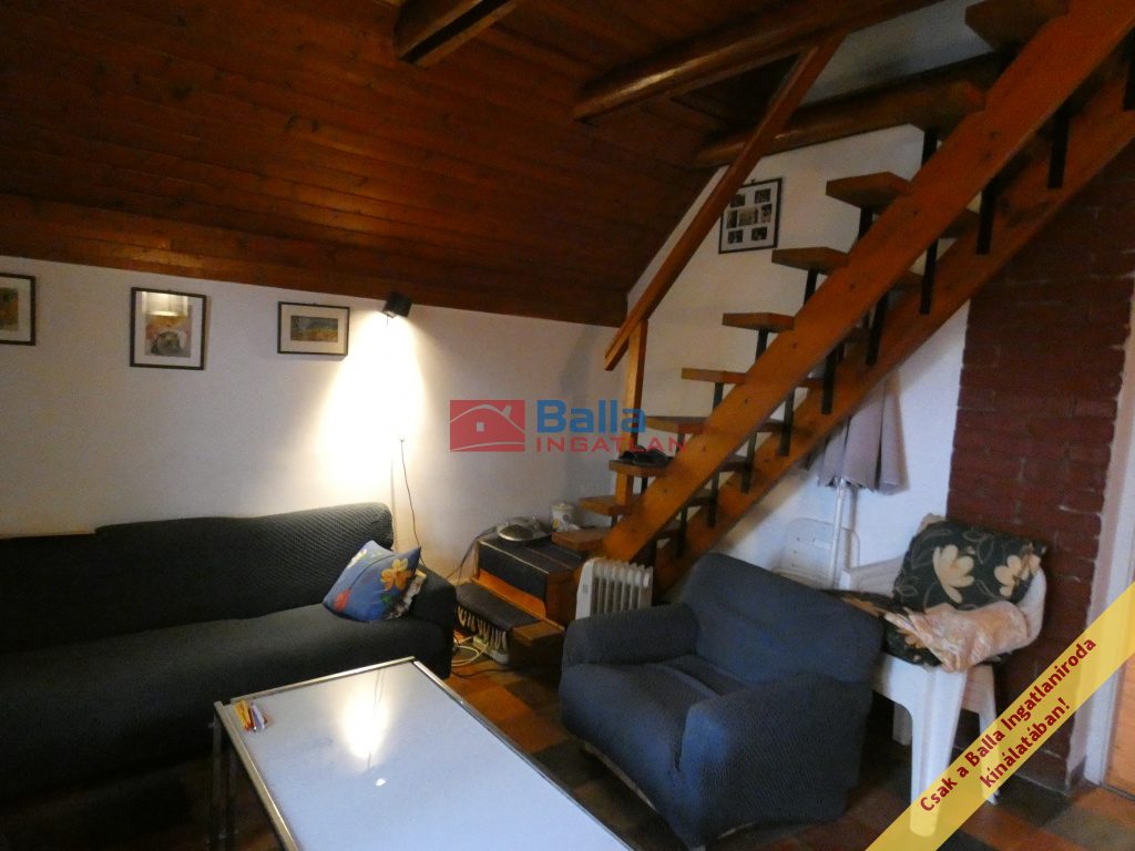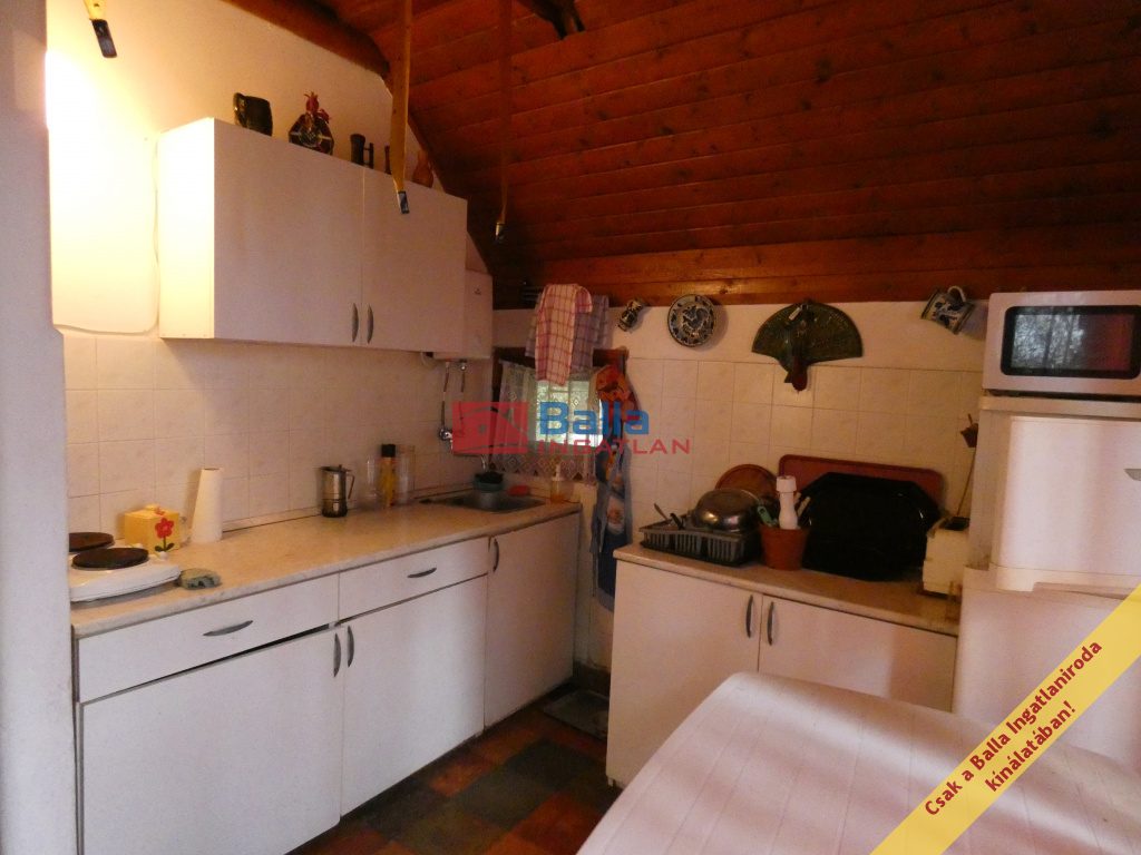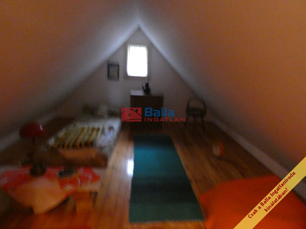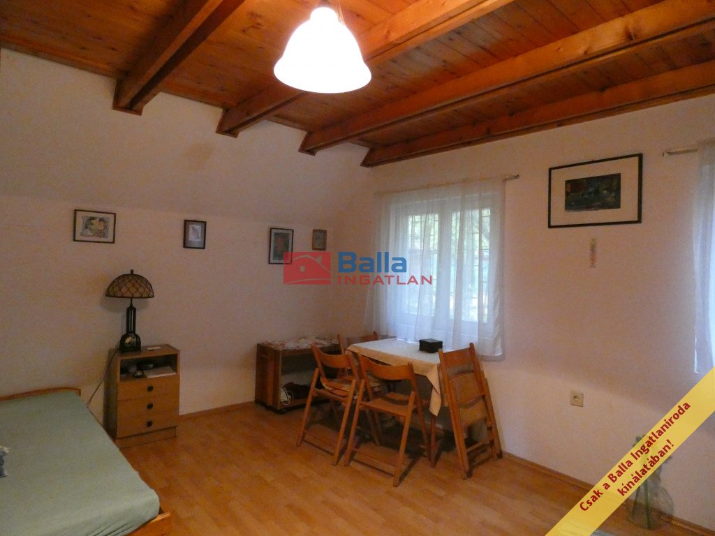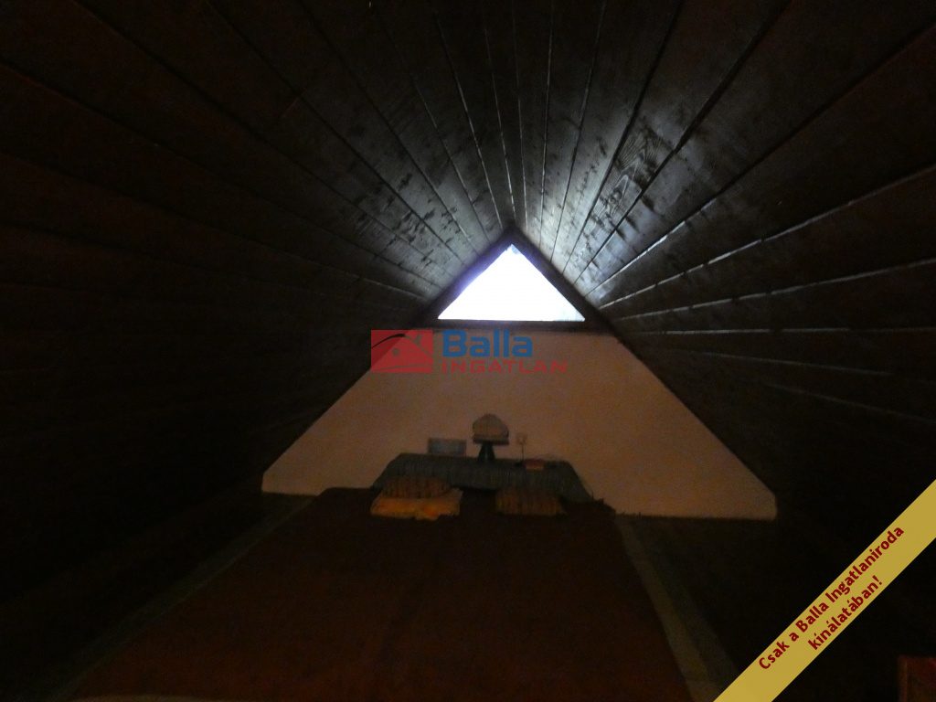 A telken lévő ház 48nm-es, két ütemben épült. Felújítandó állapotú. Egy amerikai konyhás nappali és egy nagyméretű szobából áll. A zuhanyzós fürdőszoba és a toalett egy helységben található. A nappaliból kényelmes lépcsőn lehet felmenni a tetőtérben, amely két helységből áll, hálószobának használták, de sajnos a belmagassága alacsony.