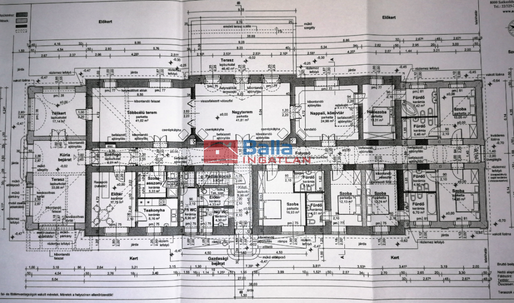3959 m2 területen bruttó 517,69 m2 /netto 358,84 m2 + 20,21 m2 tetőtér/ , 4 szoba, télikert,nappali és a vendégek fogadására alkalmas 41 m2 terem irodaházként működött.