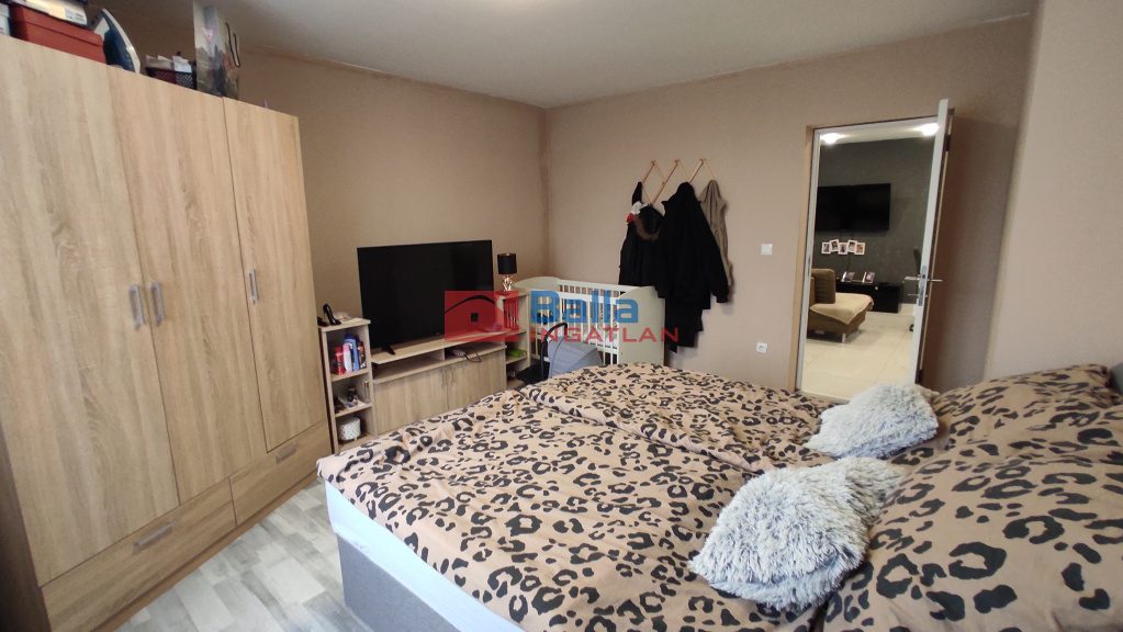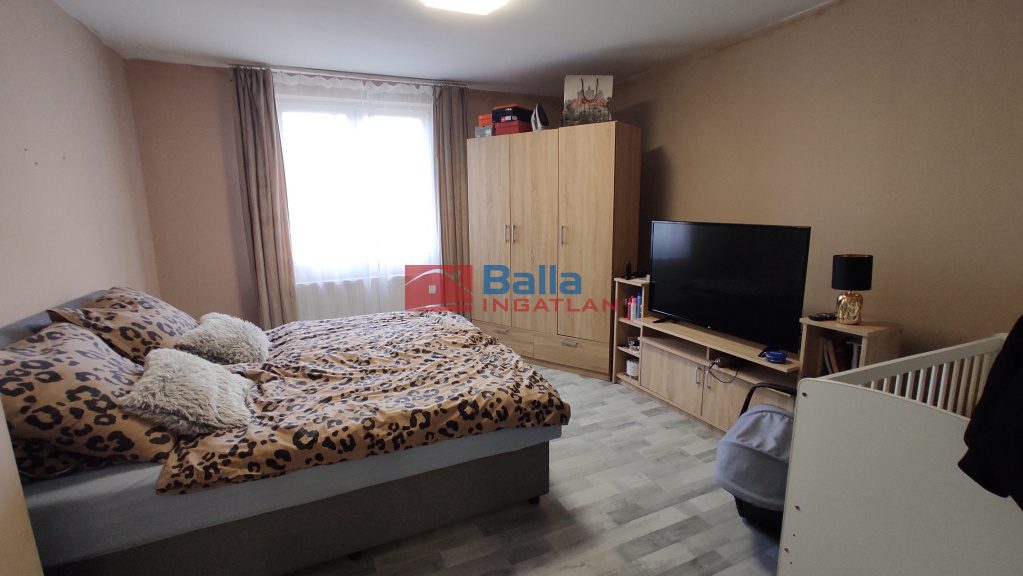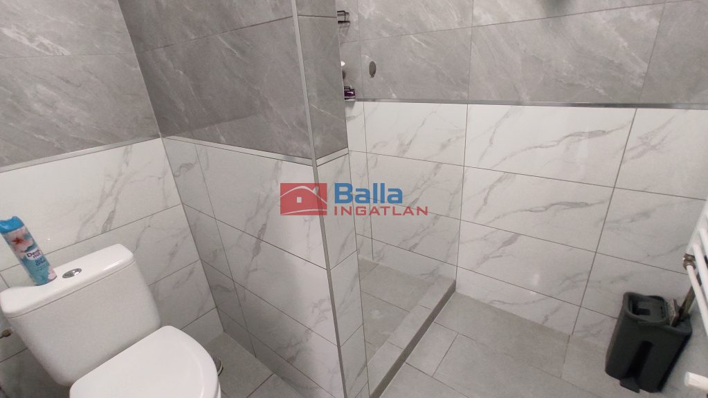 2 különnyíló hálószoba (18nm-esek),laminált parkettával, fürdőszoba épített zuhanyzóval és WC-vel egy légtérben kapott helyet (4nm),