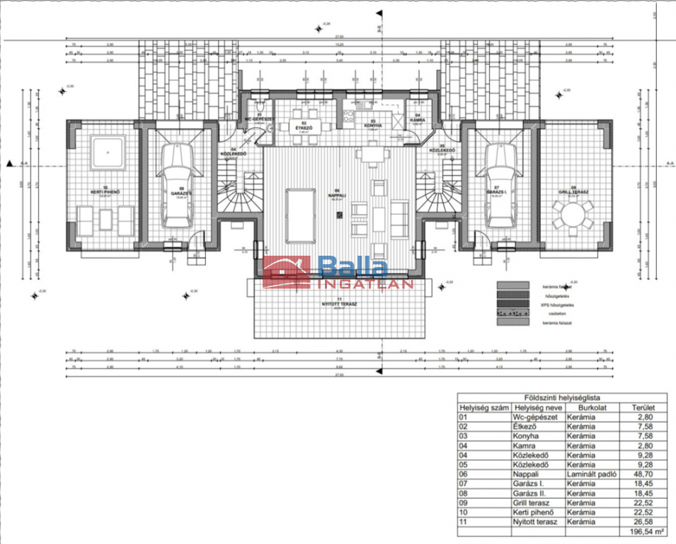 FÖLDSZINTEN amerikai konyhás nappali (24.35+7.58 m2), külön mellékhelyiség (2.8 m2), közlekedő (9.28 m2), garázs (18.45 m2), nyitott (13.29 m2) és fedett (22.52 m2) terasz.