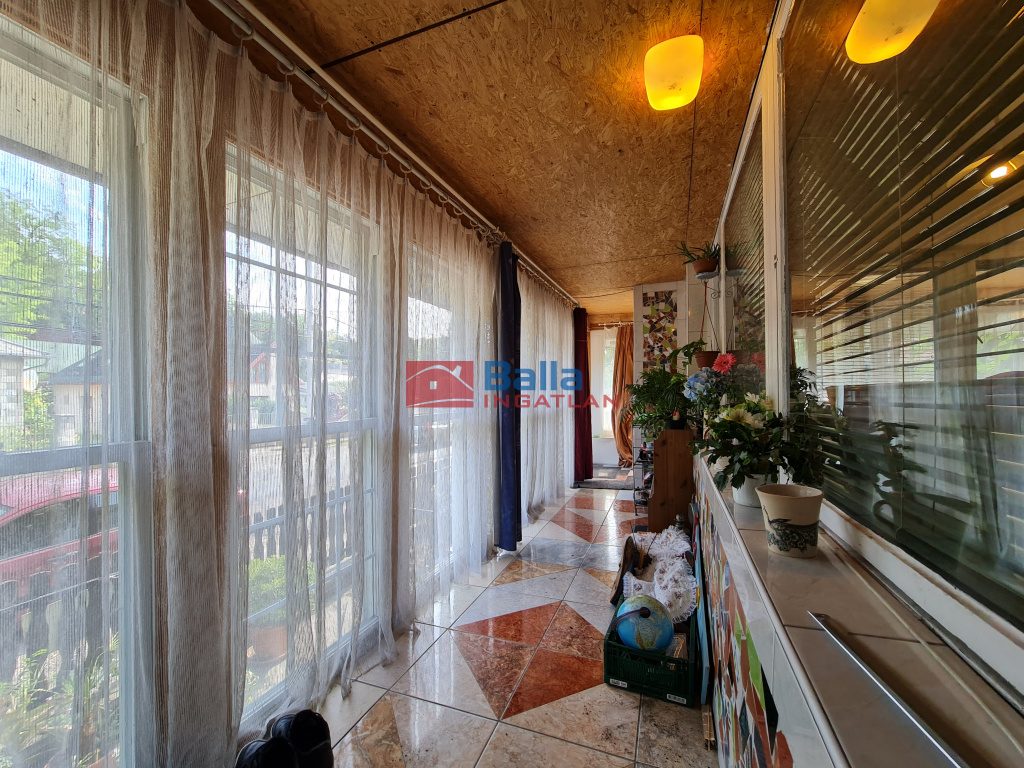 A földszint igazi különlegessége az L alakú, teljesen beépített veranda, amelyet ablakok határolnak, így a természetes fény szabadon áramlik be, miközben télen hőszigetel, nyáron pedig a nappaliba telepített klíma gondoskodik a kellemes hőmérsékletről.
