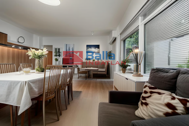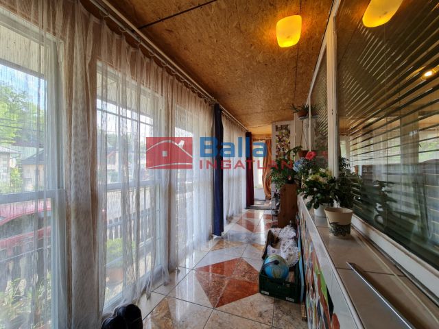 A földszint igazi különlegessége az L alakú, teljesen beépített veranda, amelyet ablakok határolnak, így a természetes fény szabadon áramlik be, miközben télen hőszigetel, nyáron pedig a nappaliba telepített klíma gondoskodik a kellemes hőmérsékletről.