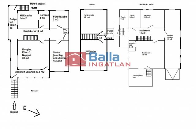 A szuterén szint közel 100 m²-en terül el, és nem csupán tárolókat, műhelyt és garázst kínál, hanem egy nagyobb helyiséget és egy félig kialakított fürdőszobát is. A zöldségtároló külön kis világa még a szuterén alá is benyúlik,igazi ritkaság, ami a ház gazdálkodó múltját idézi.