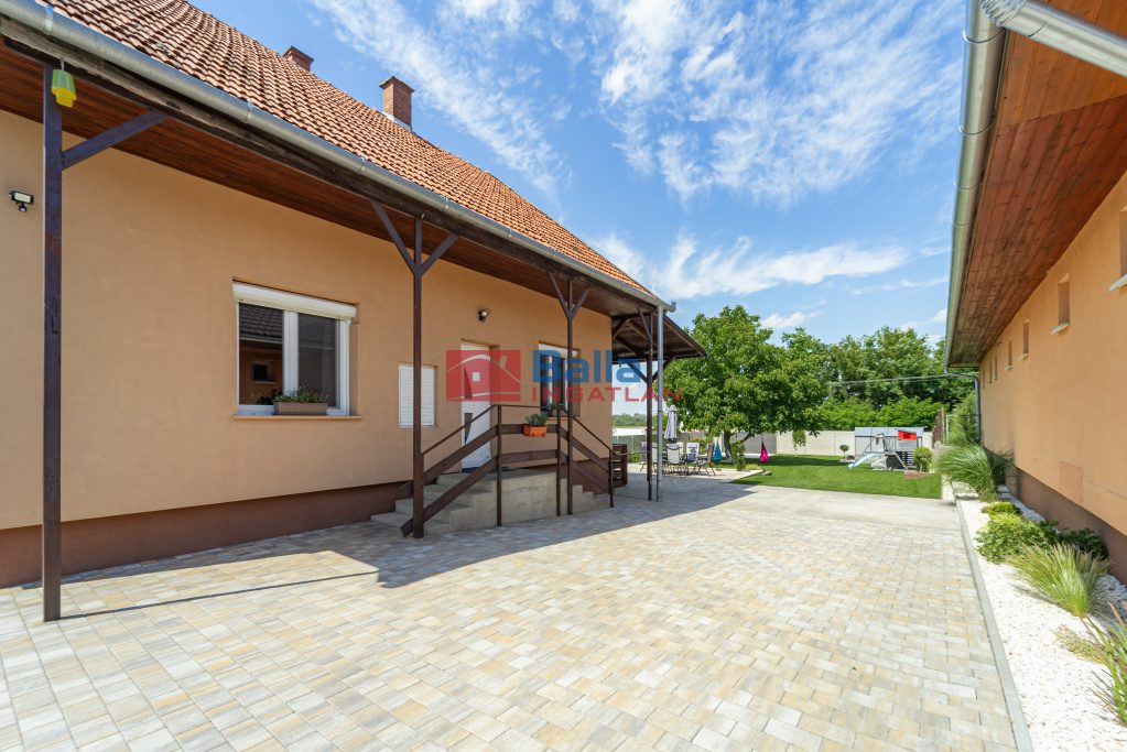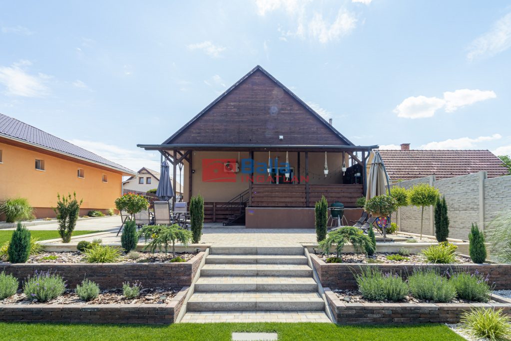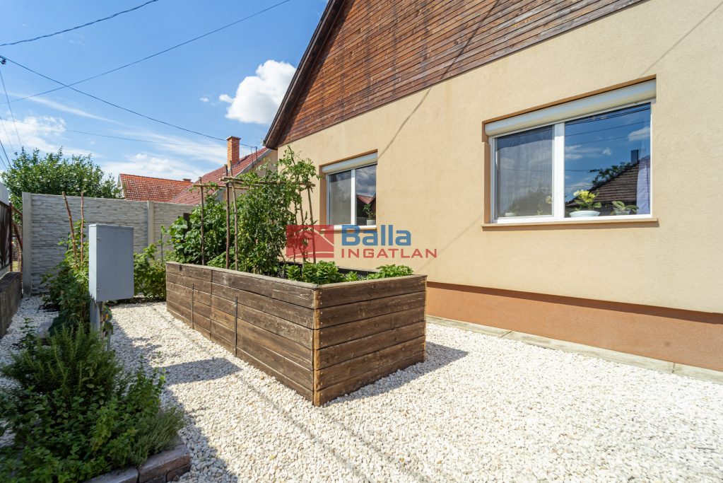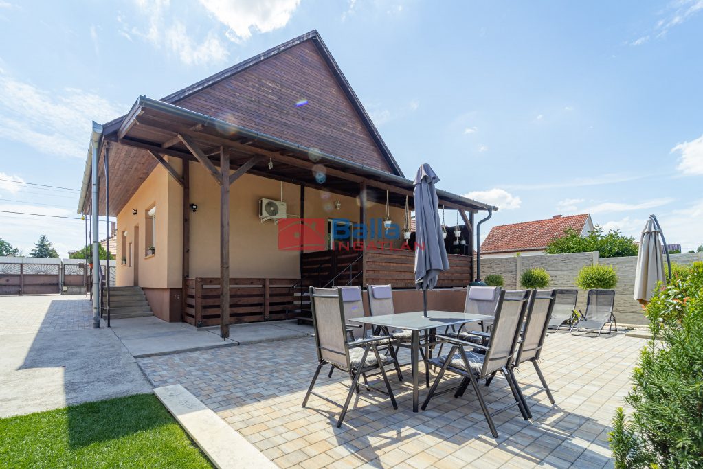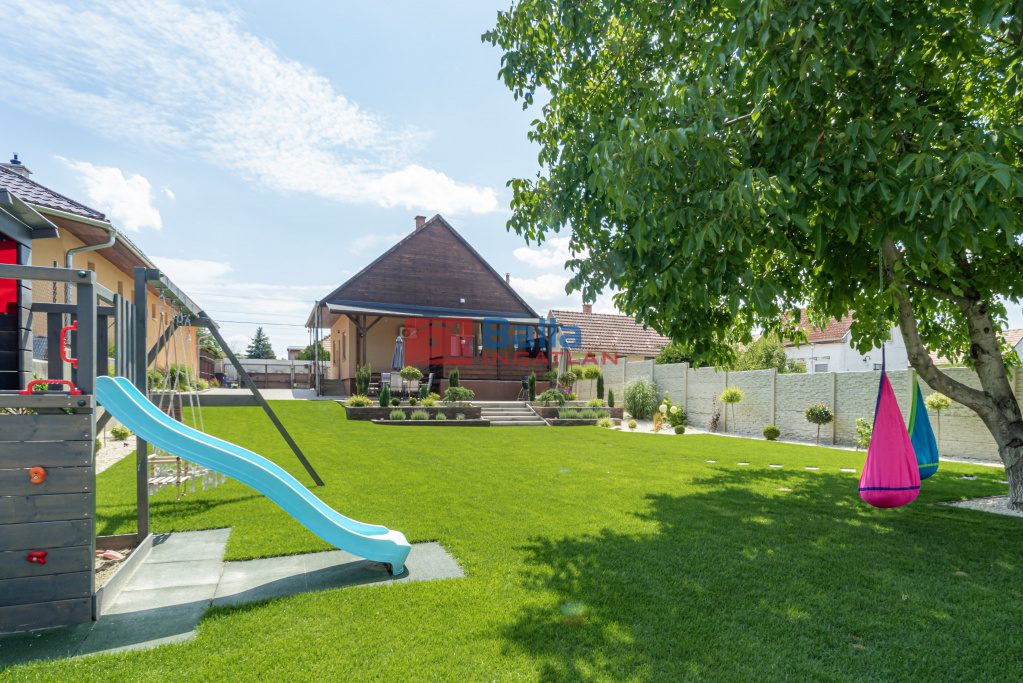 Extrák: Teljesen felújított ház, hőszigetelt nyílászárók redőnnyel és szúnyoghálóval, biztonsági bejárati ajtó, minőségi burkolatok, fűtés gázkazánnal és vegyes tüzeléssel, hűtő-fűtő klíma, beépíthető tetőtér további szobákhoz, szinte teljesen bútorozott és gépesített, 773 m² parkosított kert, automata öntözőrendszer fúrt kútról, robotfűnyíró, játszótér, kutyakennel és virtuális kerítés,16 m² fedett terasz, 32 m² száraz szigetelt pince, térkövezett autóbeálló több autónak, két utcára nyíló telek.