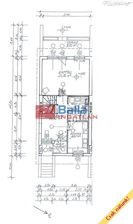 Az 50 nm-es földszinten helyezkedik el a barátságos, napfényes nappali a 10 nm-es rendkívül kellemes terasszal és kertkapcsolattal, a konyha, kamra, külön étkező, a mosókonyha és wc.