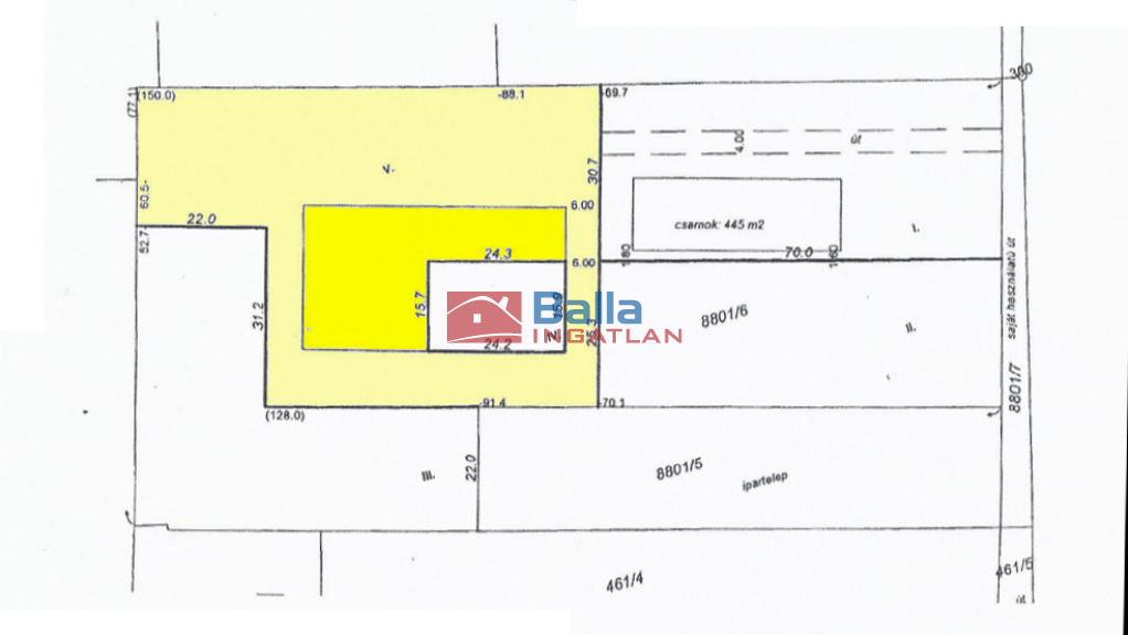 A telek területe 3500 m2, mely egy osztatlan közös terület, önálló telephelyként működő elkerített része. Ügyvédi megosztással rendelkezik. Aszfaltos útról könnyen megközelíthető.