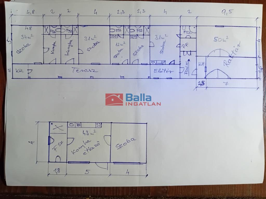 A telek baloldalán álló épületben 4 db (konyha, szoba, fürdőszoba+WC) lakás albérletbe kiadott. A telek jobb oldalán álló épületben 1 db albérletbe kiadott lakás (konyha+étkező+nappali, szoba, fürdőszoba+WC).