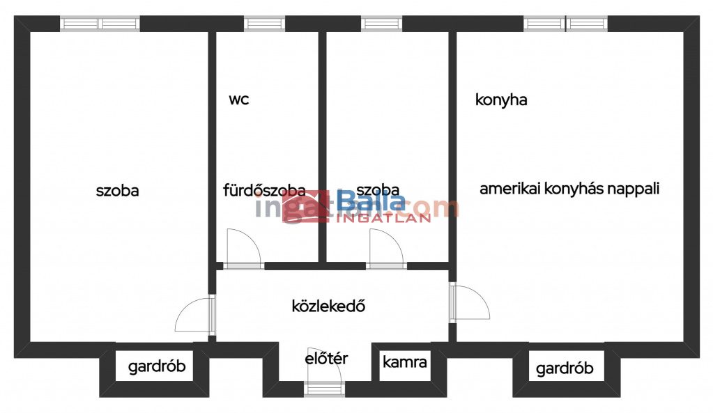 A lakásban külön nyíló nagy 18 nm-es AMERIKAI KONYHÁS NAPPALIVÁ átalakított szoba, egy 11 nm-es és egy 7 nm-es fél szoba, előszoba, közlekedő, 2 gardrób, káddal kialakított fürdőszoba benne wc és egy kamra található.