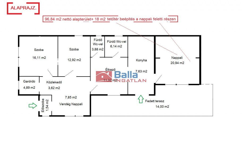 1.számú. lakóegység(főépület): 96,84 m2. nettó.+ 18 m2 tetőtéri ráépítés. Összesen: 114,84 m2. nettó.