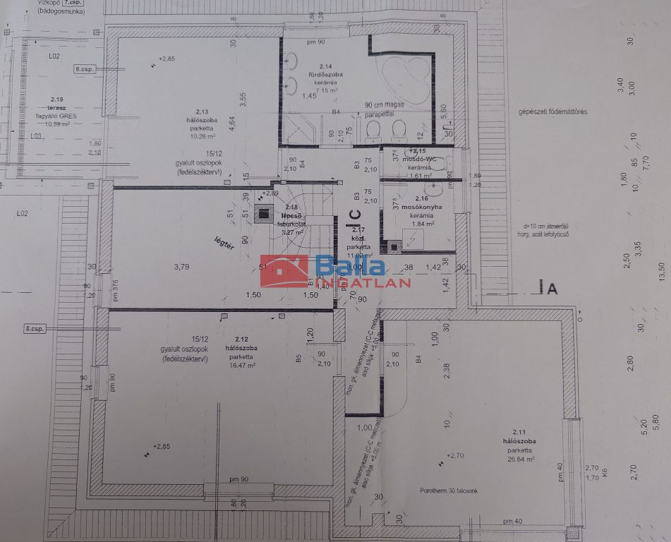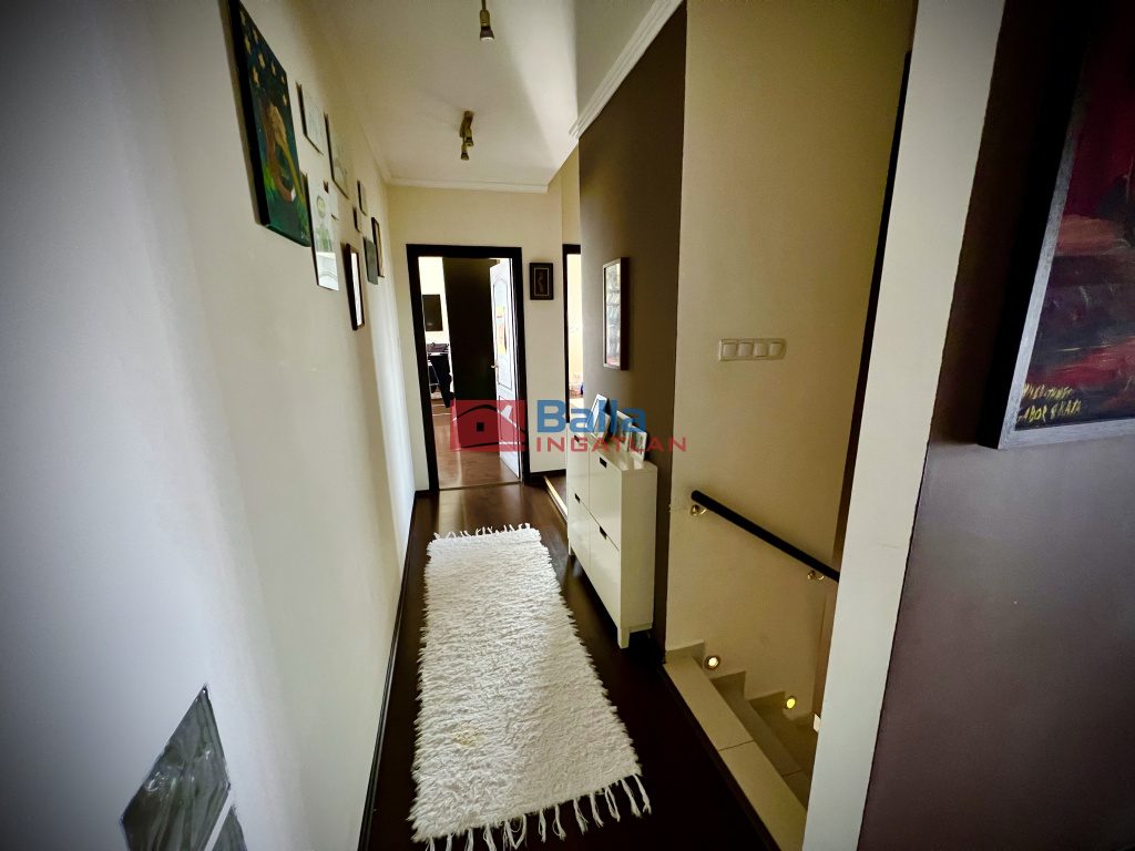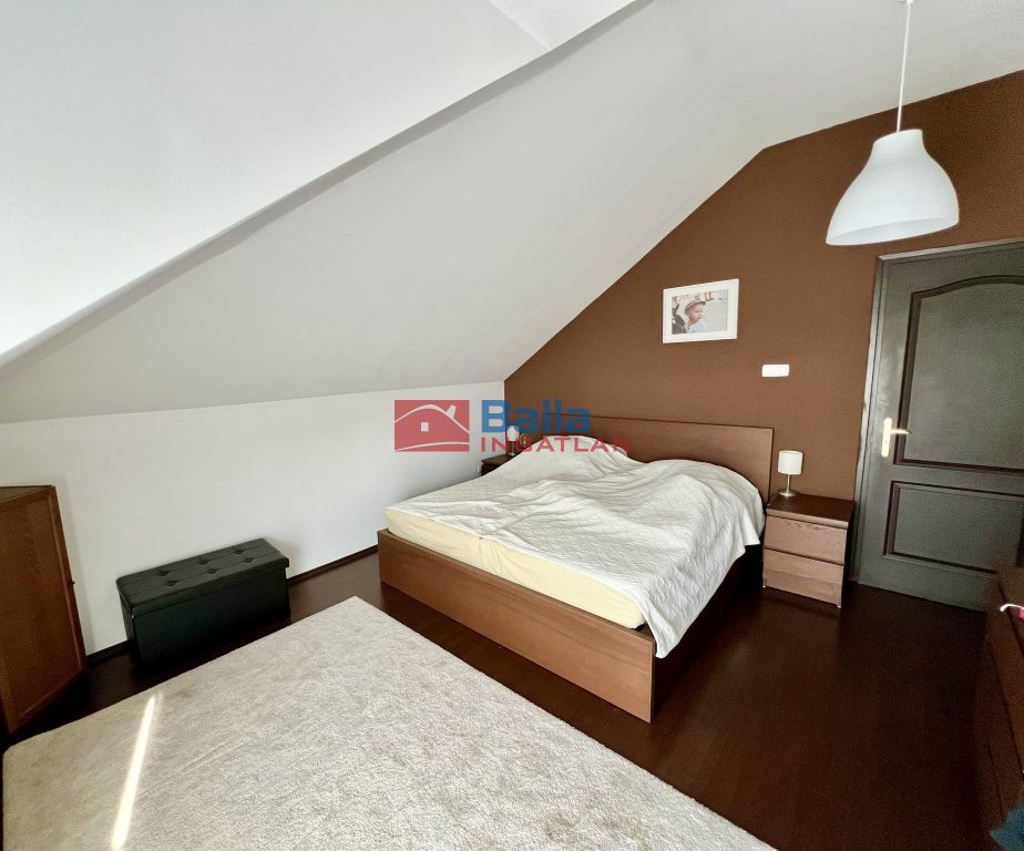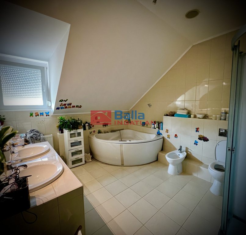 Emelet: a) 3 db lakószoba, melyek 29, 17 és 13 nm-esek (nagy térérzettel) b) 13 nm fürdőszoba 2 személyes sarokkáddal, zuhanyfülkével, 2 mosdókagylóval, wc-vel, bidével. c) 12 nm-es, emeleti mediterrán terasz d) 10 nm-es gardróbszoba e) 6 nm-es mosókonyha.
