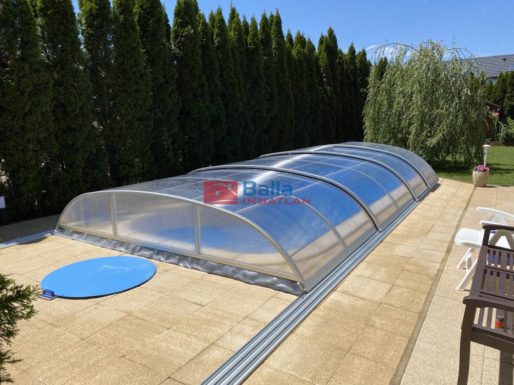 b) fűtött úszómedence (18 m2) hőszivattyúval, sóbontó rendszerrel tisztítóval (vegyszerek nélkül üzemel) gépházzal