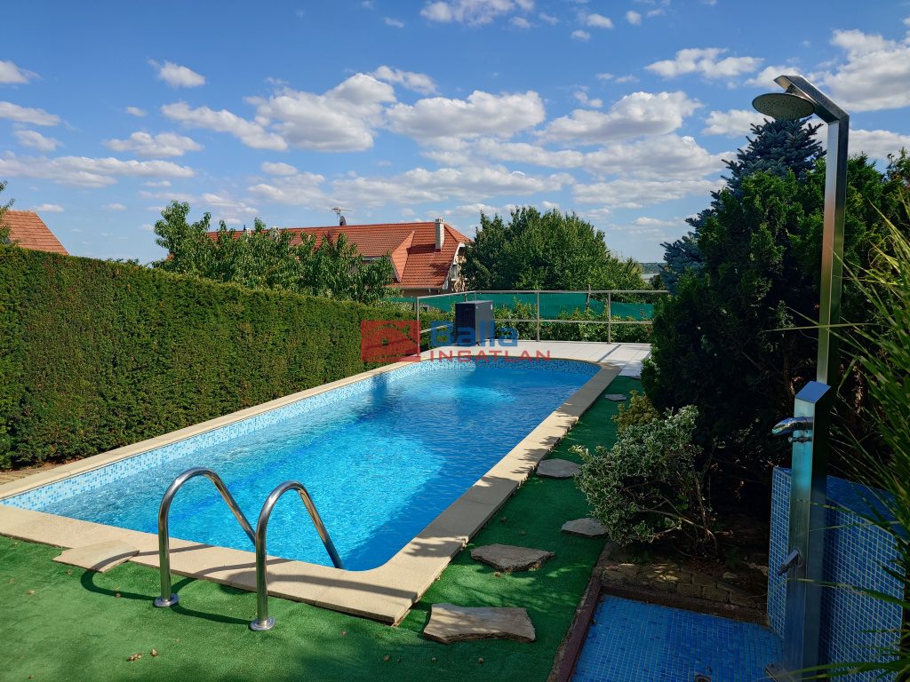 b) fűtött úszómedence hőszivattyúval, kültéri tusolóval, modern gépházzal