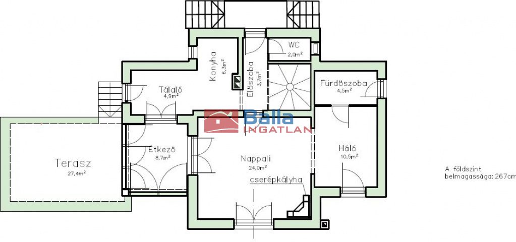 Előszoba: 3,7 m2; WC: 2,0 m2; lépcsőtér: 4,1 m2; nappali: 24,0 m2; háló: 10,5 m2; fürdőszoba: 4,5 m2;; konyha és tálaló: 12,3 m2;; étkező: 8,7 m2; összesen: 69,8 m2 + terasz: 27,4 m2