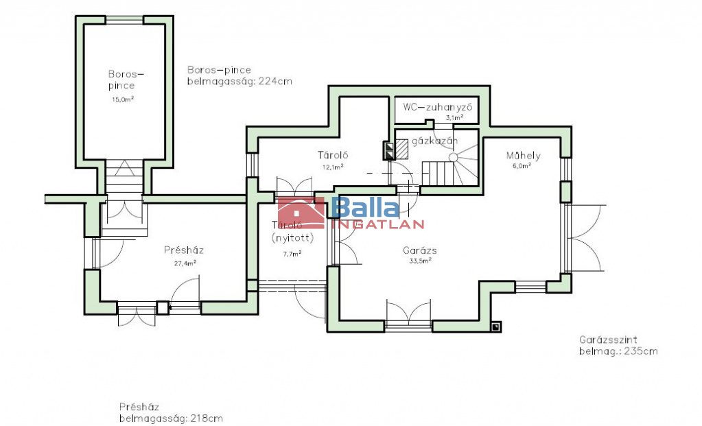 garázs 33,5 m2;; szerszám tároló 6,0 m2; előtér-lépcsőtér 6,6 m2; WC-zuhanyzó: 3,1 m2; tároló-kamra: 12,1 m2;; géptároló: 7,7 m2; présház; 20,0 m2; pince: 15,0 m2 - összesen: 104,0 m2
