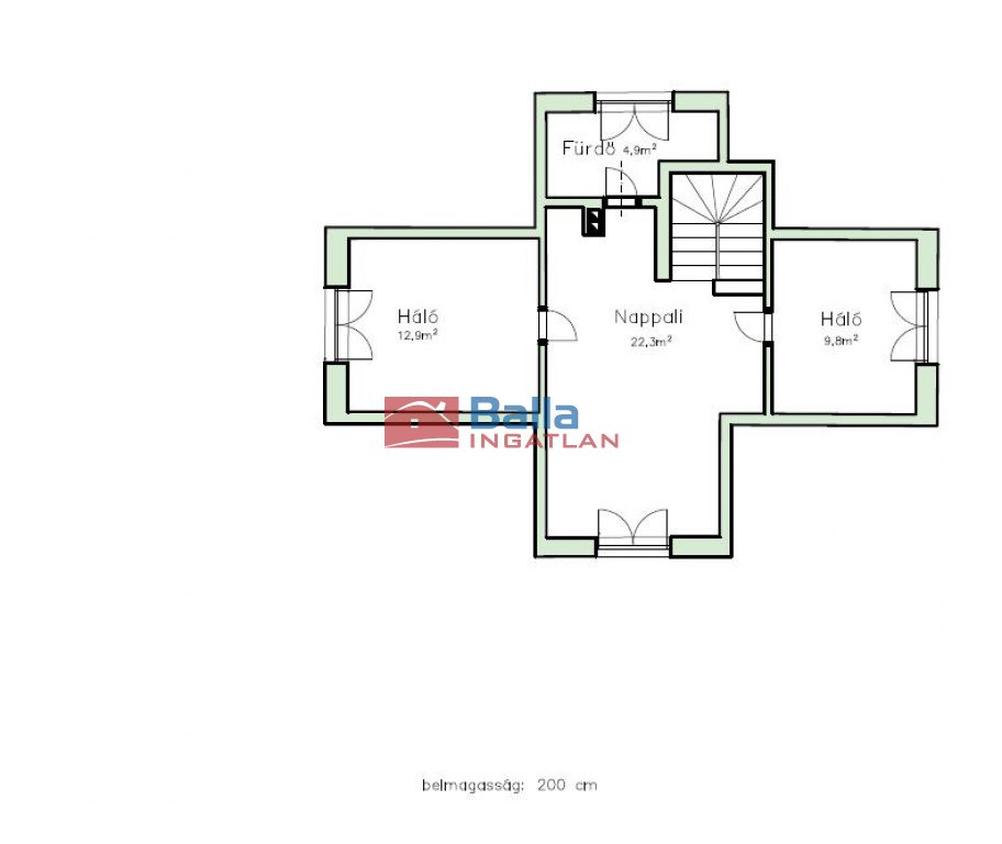 Nappali: 22,3 m2; háló (keleti oldal): 9,8 m2; háló (nyugati oldal): 12,9 m2;; fürdőszoba: 4,9 m2; lépcsőtér: 4,1 m2; - összesen: 54,0 m2