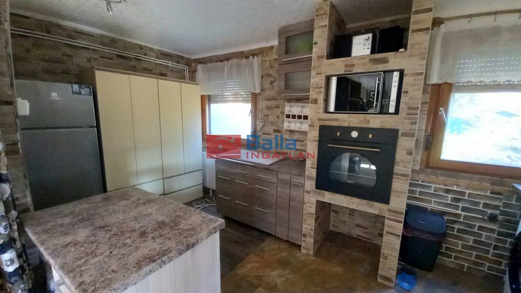 Az épület földszintes, részben FELÚJÍTOTT könnyűszerkezetes, 45 nm-es (+14 nm fedett terasz), 3 szobás, étkezőkonyhás, kamrás. D-Ny fekvésének, hatalmas ablakainak köszönhetően a terek világosak, és az egész csodaszép kertre rálátni.