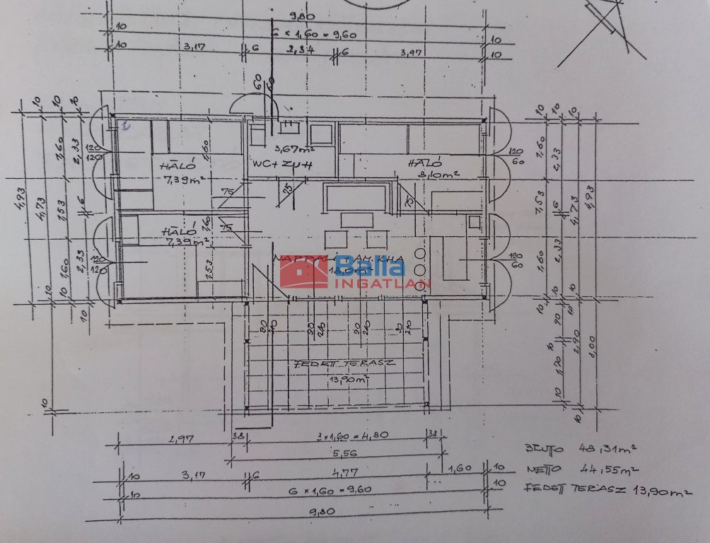 Az épület földszintes, részben FELÚJÍTOTT könnyűszerkezetes, 45 nm-es (+14 nm fedett terasz), 3 szobás, étkezőkonyhás, kamrás. D-Ny fekvésének, hatalmas ablakainak köszönhetően a terek világosak, és az egész csodaszép kertre rálátni.