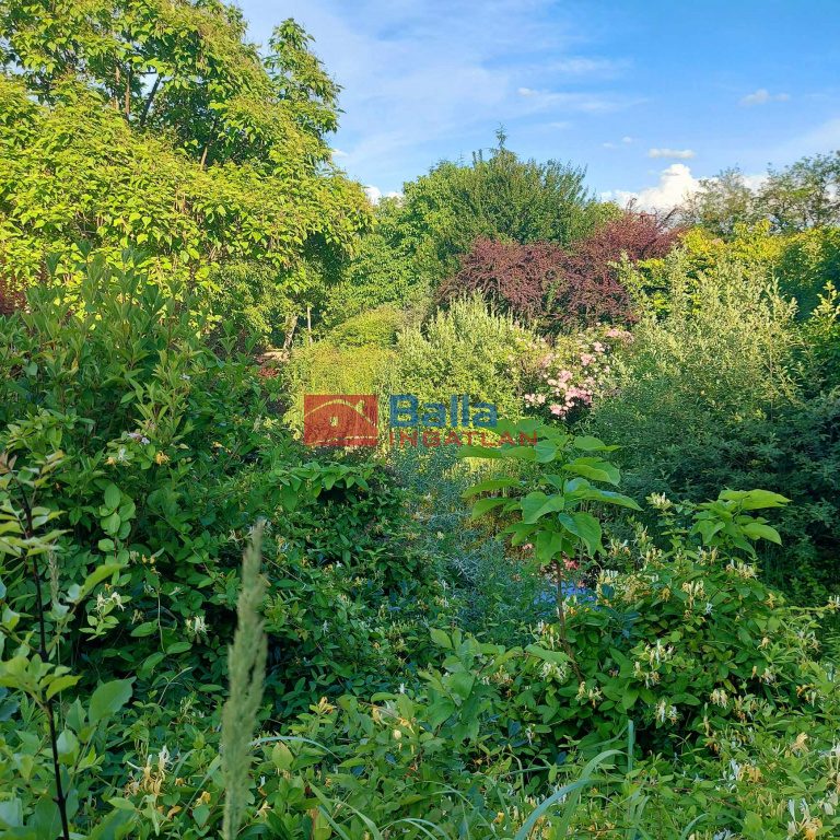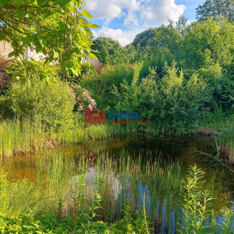 A telken több termő gyümölcsfa, virágok, rózsák, magas ágyás és kerti tó csobogóval került kialakításra.