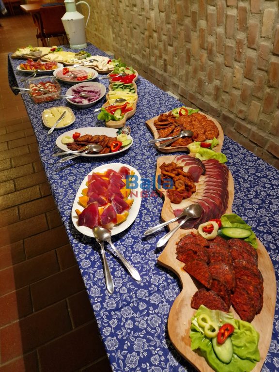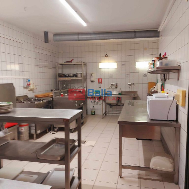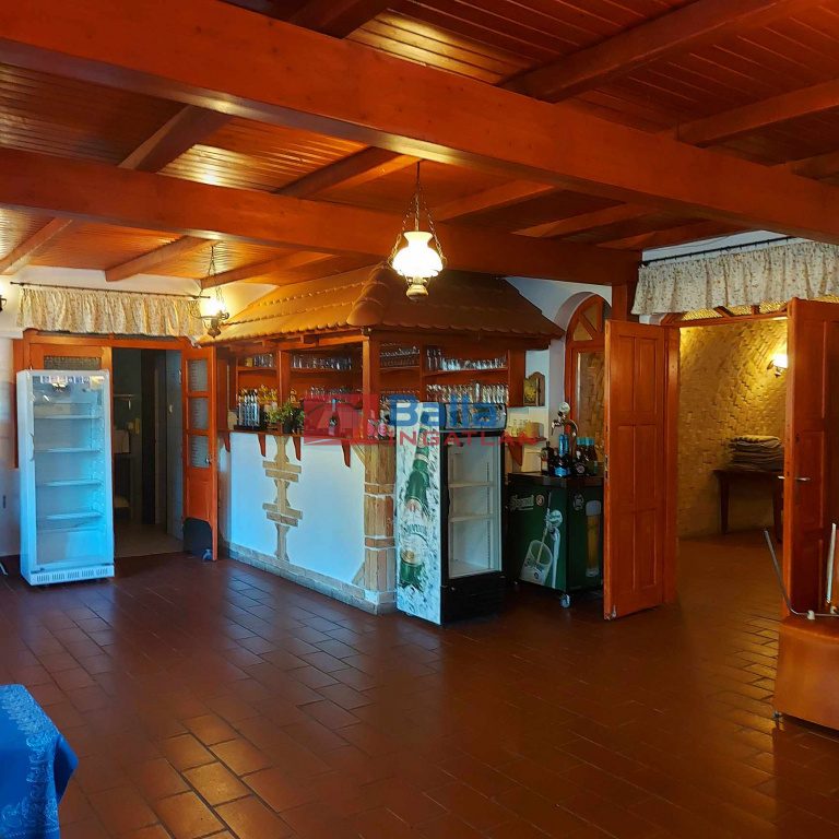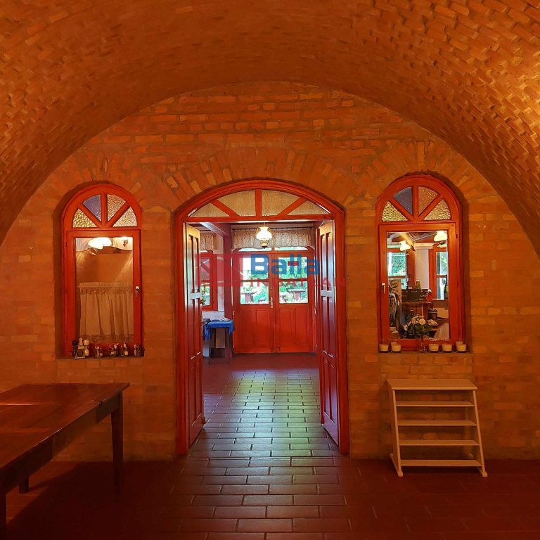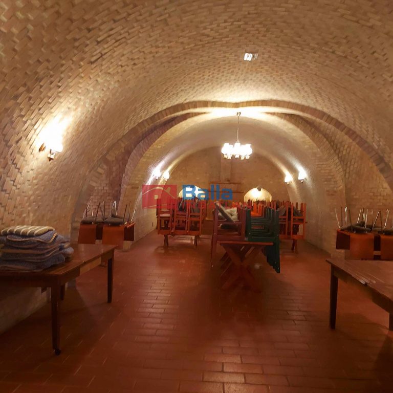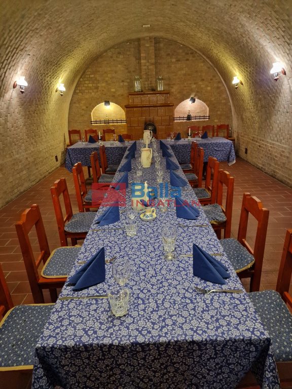 Az épület alsó szintjén került kialakításra a boltíves pince rész. Az előtérben söntéspult található autentikus búbos kemencével és az előkészítőkkel rendelkező 380V, áramellátással működő főzőkonyha. A 3x32. Az ingatlanhoz tartozik egy 50m2-es riasztóval felszerelt raktárhelyiség.