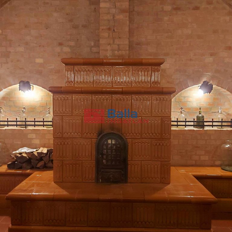 A pince részen egy impozáns ülőpados cserépkályha biztosítja a családias meleget.