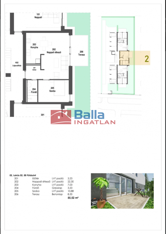 2. lakás: 55,52 nm 46,97nm + 8,55nm terasz + 27nm kertkapcsolat : 97.076.100.-Ft
